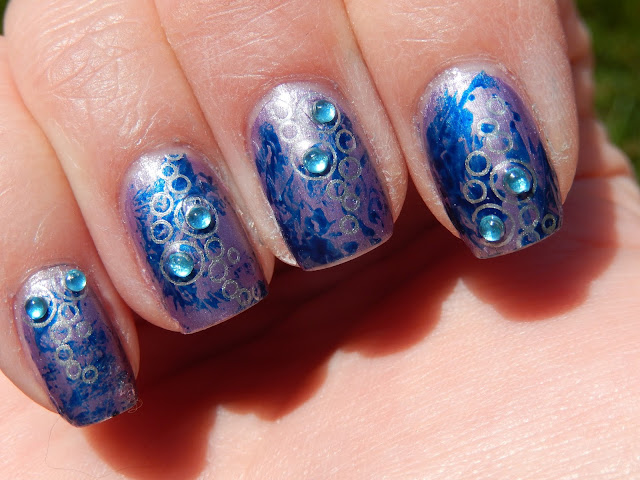 Next, I stamped a bubbly circle image from Cheeky plate 26 with Barry M Silver Foil. I finished off the look with blue rhinestones in the middle of the biggest circles: