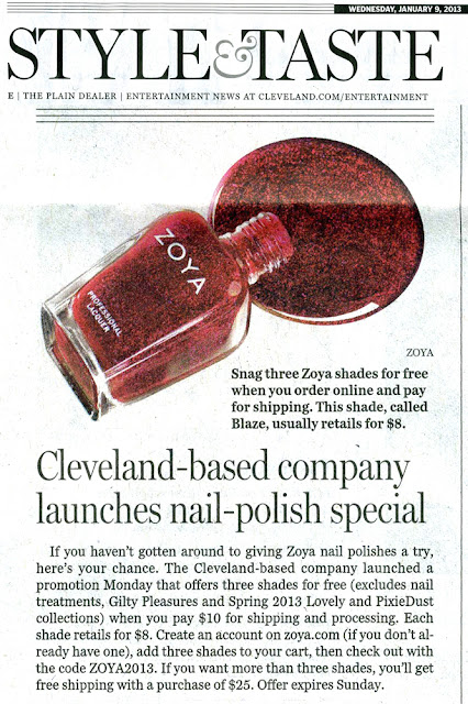 Cleveland Plain Dealer Editor, Emily Hamlin Smith, says now is the perfect time to try Zoya Nail Polish by taking advantage of the Zoya Color Your World 2013 Promotion. Get three nail polish shades ($24 value) FREE*, just pay $10 for Shipping & Processing.